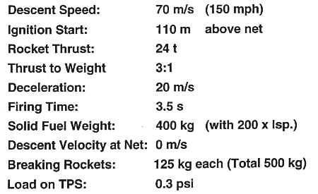 Part of the weight savings, however, will be balanced by the need for retro rockets required to slow down the descent velocity before the vehicle touches the net. If standard solid rockets are used their weight will be approximately 5% of the landing vehicle which would be considerably less than the weight of wings and retractable landing gear (See Figure 11).