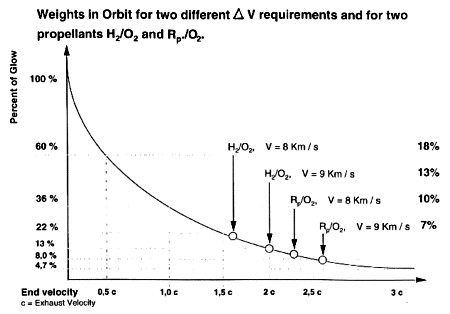 Before dealing with any space rocket design, it is important to revisit the basic rocket equation shown in Figure 1. It shows an inverse exponential relationship between the weight that reaches space and the required velocity. The curve in Figure 2 displays this relationship quite drastically, showing how little is left to reach orbit even using the most powerful propellants. The curve indicates the weight in orbit for two different velocity equivalents or delta V and for two of the most common propellants. The figures relating to the end velocity of 9 km/sec applies to a large, low drag design starting from ground while a delta V of 8 km/sec only applies when a rocket vehicle can start its run in space, without having to fight air drag and the pull of Earth gravity.