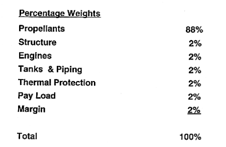 In the case of VentureStar it is assumed that the weight of the vehicle after reaching orbit will amount to approximately 12% of its launch weight. This does not leave much to work with for the structural engineers. Figure 3 shows the main components that constitute the net weight of a reusable space rocket and very rough, approximate values for their maximum weight allowance.