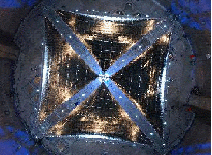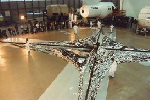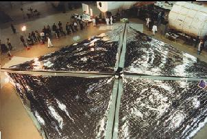 With deployable arrays with a specific mass above 1 kWe/kg, 1 MWe would have a mass of 1 tonne or less. It therefore appears quite feasible to produce space arrays in the multi-megawatt range. A standard solar array unit would be about the size of the 20-meter Scalable Square Solar Sail System which was produced by SRS Technologies.[7] This array is 20 meters square, for a total area of 400 m2. Such an array should produce at least 50 kWe with a mass of 40 kg. A 100 MWe power plant would require 2,000 such arrays, for a total array mass of 80,000 kg. A deployable 20 m x 20 m array has also been built for a space demonstration by Kayser-Threde.[8] This deployment is shown in Figure 3.