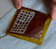 In these experiments, amorphous silicon (a-Si:H) single-junction cells were deposited on a 6 m fluorinated polyimide LaRC CP1TM film. This film was originally developed for space applications by SRS Technologies under a NASA research and development contract, and licensed to SRS. The cells were approximately 0.25 cm2, deposited on films that were 2-4 cm square. Such a test film is shown in Figure 2. These cells have an areal density of 0.030 kg/m2. In a standard air environment of AM1.5, these cells produced 95 W/m2 power output with an efficiency of 9.5% - resulting in an AM1.5 power density of 3200 W/kg. It is estimated that these same cells should generate 4300 W/kg in vacuum, at AM0!