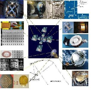 Figure 5. COTS-like (commercial off the shelf) components for 1.2 MW SSPS Array. Clockwise:Welsom Ultra-lightweight CFRP Boom CP1-CORIN/a-Si:H Solar Arrays, Bigelow Manned Capable Inflatable Space Habitat, ESA-ESTEC DS4G Ion Thrusters, NASA Hall Thruster, Inflatable Antenna and Inflatable Millimeter Wave Reflector, Offset Feed Horn Microwave Sending Antenna, Mitsubishi/JAXA Magnetron Microwave Generators, Planar Antennas and send/receive arrays, piezoelectric sensor/actuator resonant vibration dampers and thin film field emitters.