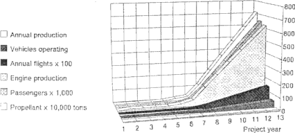 Analysis of the production costs of Kankoh-maru and its various components involves comparison of the parts and sub-systems with other products of which companies have production experience. The production costs will also depend on the rate of production. Thus for example, in the scenario shown in Figure 4 the rate of production of Kankoh-maru vehicles reaches a steady level of 8 vehicles per year. Since each vehicle uses 12 rocket engines, the rate of production of rocket engines is some 96 per year. However, if these engines have a lifetime of 1 year each, the annual production rate would increase every year: 96, 192, 288, 384... and so on. This has important implications for achieving low unit costs through mass production.