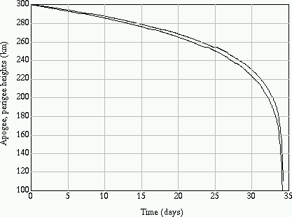 The main effect of atmospheric drag on an orbiting spacecraft is to reduce its orbital altitude gradually but continuously, causing it to spiral in towards the Earth, slowly at first but at a gradually accelerating rate. In the final phase, once an altitude of around 180 to 200 km has been reached, it takes only a few hours to reenter and (usually) burn up. Figure 1 illustrates this behavior for the particular case of a spacecraft initially orbiting at an altitude of 300 km.