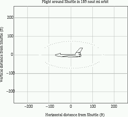 Space Shuttle missions to Mir also usually involve a "fly-around" of Mir after separation, allowing inspection of the station for external damage, etc. Figure 5 shows a typical example of such a path around the Space Shuttle. A similar fly-around of the hotel by Kankoh-maru would probably be popular with guests, since it would give them a range of interesting views of the hotel against the backgrounds of both the Earth and the stars. Consequently, when the flight schedule permits, a fly-around of the hotel may be performed on first approach to the hotel and/or on departure.