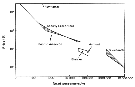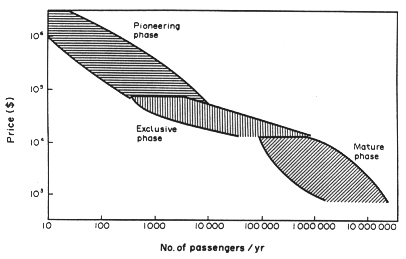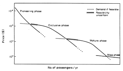 Figure 2 is a demand curve derived by plotting these different estimates (using logarithmic axes). It is perhaps not too far-fetched to claim that three phases are distinguishable. The "pioneer" phase approximately corresponds to the cost of taking passengers on the Space Shuttle - if it were to carry fare-paying passengers. (This possibility was in fact explicitly ruled out by NASA (10)). While the Society Expeditions Pacific American project would seem to represent something between the first and second phases, Ehricke's and Ashford's projections clearly relate to the "mature" phase. However, if Society Expeditions' figures turn out to be correct, the level of demand towards the right-hand side of the graph is likely to be significantly higher than Ehricke and Ashford assumed - particularly in view of the fact that the latters' figures assumed that guests would spend several days in hotel accommodation, by contrast with the very limited facilities to be offered initially by Society Expeditions.