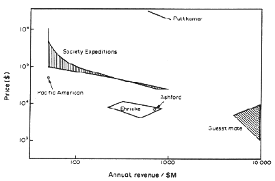 In 1985 the travel company Society Expeditions of Seattle, Wash., which specializes in the provision of exotic holidays (such as voyages through the North-West Passage), published an estimate of the demand for space tourism at the higher priced end of the demand curve (Table 2). Society Expeditions' concept is somewhat different from that of Ehricke or Ashford. The customers would stay for some 7-10 days tn a hotel/training facility on Earth, where they would participate in familiarization and training courses for space flight, followed by a short trip to LEO. In the initial stages at least, there would be no orbital hotel. This service is clearly aimed towards the "pioneering" and "exclusive" phases described above. These figures constitute a rather more bullish view of the market than the assumptions of Ehricke and Ashford, but they are perhaps likely to be more accurate due to the company's commercial interest in the matter.