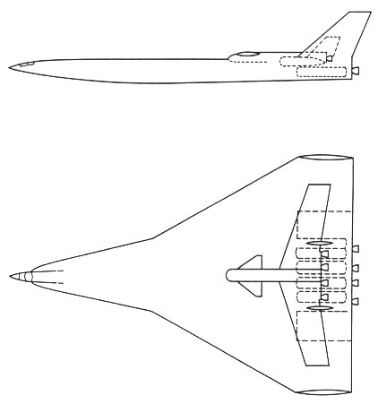 The booster stage of Spacebus is a large, supersonic aeroplane, with twice the take-off weight of Concorde. It has turbo-jet engines for take-off. accelleration to Mach 3-4, and flyback and landing. Four rocket engines of J2S or HM6O performance are installed in the aft fuselage. These provide acceleration to the separation speed of Mach 6. which occurs at the top of a semi-ballistic climb to an altitude where the dynamic pressure is low (reducing both air loads on the orbiter, and heating loads on the booster). The orbiter stage of Spacebus consists of a conventional airliner fuselage with a capacity of some 40 passengers. The liquid oxygen/liquid hydrogen propellants are carried in a large, thick, pressure-stabilized wing. The orbiter's engines are two J2S/HM6O motors. Leading data for Spacebus, derived from first order sizing calculations. are given in Table 3. A concept sketch of Spacebus is shown in Fig. 5.