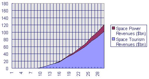 In reality, the total amount invested commercially in passenger space travel services and other commercial space activities that develop from them over the next 30 years could reach several times the amount shown in Figure 3.4.2 - say $1 trillion - without strain. Indeed, that is only the amount of taxpayers' money that government space agencies are planning to spend over the same time period - though without comparable economic benefits. In that case this commercial investment will create several hundreds of $billions/year turnover of new commercial space activities, providing the basis for a well-founded, world-wide economic boom that could finally dispel all pessimistic concerns about the Earth's limited resources, the inevitability of poverty for much of the world's population, and so on.