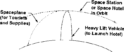 Given mature launchers, it seems highly probable that a typical future space holiday will consist of a few days or more in a space hotel i.e. a space station equipped for accommodation, leisure, education, and entertainment. The hotel will probably be assembled in low Earth orbit from modules launched by a Heavy Lift Vehicle. Tourists, crew and supplies will be ferried up and down in spaceplanes. This "mature orbital infrastructure• is shown in fig. 1.