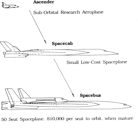 A prototype of Spacecab could be flying within about five years, and Spacebus a few years later. The maturity gained by Ascender in terms of rocket and thermal protection system life and maintenance cost could be transferred very rapidly to Spacecab and Spacebus. Thus orbital flights could also approach maturity in about the fifteen years mentioned earlier.