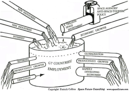 It is therefore very striking that OECD governments not only provide no funding at all for this purpose, but, following the advice of their monopoly space agencies, they decline to even discuss the possibility! This situation is illustrated in Figure 3: the 1 trillion USD that governments have invested in space activities to date have generated little economic benefit precisely because those responsible for allocating this expenditure have chosen not to invest in the activity for which there is known to be the greatest popular demand. Governments' supposed "investment" in space development is thereby converted into an economic burden on taxpayers - taxation without corresponding economic benefits, and expensive waste of many highly-educated engineers' work. This unsatisfactory condition will continue until the knowledge which this expenditure has generated is applied to supplying services which large numbers of the general public wish to purchase, thereby earning profits with which to repay the capital invested to date. The only space activity which is a candidate for this role is passenger travel, for which there is known to be potentially great demand if popular services can be offered at attractive prices.
