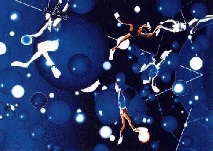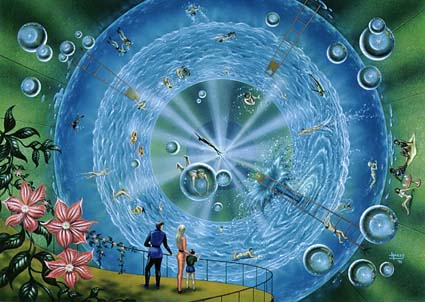 In the case of a space tether, in order to achieve partial gravity even as small as 0.01 g would be necessary to use a tether several kilometers in length. Although this may be realized at some time in the future, in the following we consider the more compact design of a rotating, cylindrical swimming pool. Figure 3 is an illustration of such a pool by the British space artist David Hardy.