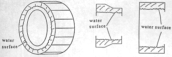 Using rotation for obtaining artificial gravity, it will not be necessary to enclose the water completely. For example water could be contained within a rotating wheel with a trough-shaped cross-section. Various layouts would be possible, within the overall constraint that the inner surface of the water will always remain cylindrical, ie locally "flat". For example, by selecting an appropriate shape for the "bottom" of the pool, the water depth need not be uniform but could be varied along the length of, or around the pool, as in Fig 4b. Also, the pool might be closed on one side and open on the other (Fig 4c).
