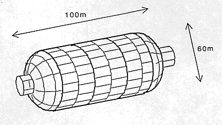 For the purposes of such sports we consider a stadium roughly equivalent to a commercial sports stadium on Earth 100 meters in length and 60 meters wide. Such large structures will be much easier to construct than on Earth, since there is no problem arising from the weight of members. On Earth the weight of the structural members becomes increasingly important for larger structures, so zero-gee is proportionately more beneficial for building larger structures.